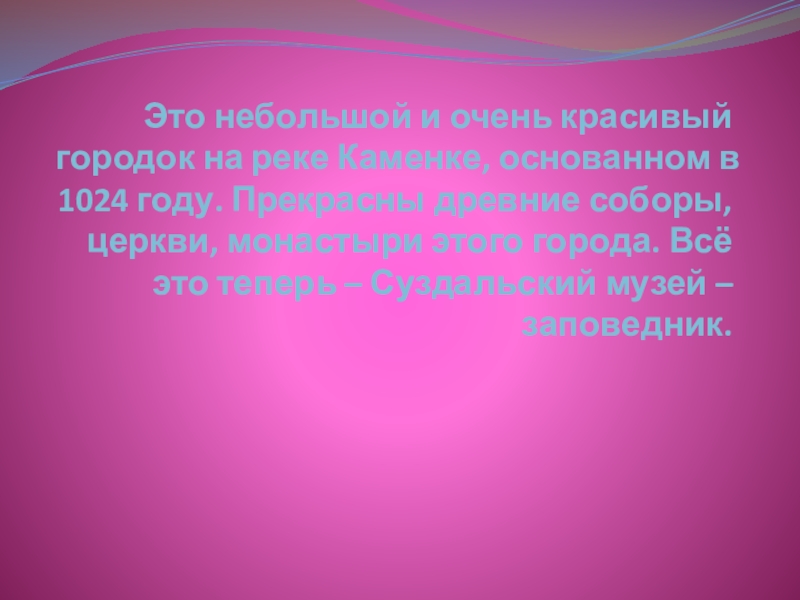 1024 году. Прекрасны древние соборы, церкви, монастыри этого города. Всё это теперь – Суздальский музей – заповедник.