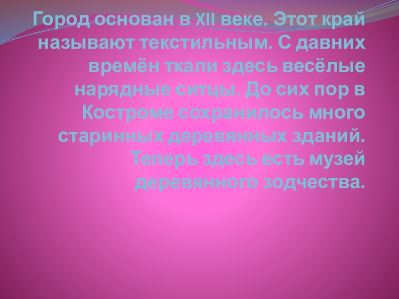 времён ткали здесь весёлые нарядные ситцы. До сих пор в Костроме сохранилось много старинных деревянных зданий. Теперь здесь есть музей деревянного зодчества.