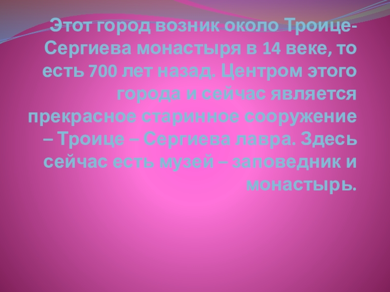 есть 700 лет назад. Центром этого города и сейчас является прекрасное старинное сооружение – Троице – Сергиева лавра. Здесь сейчас есть музей – заповедник и монастырь.
