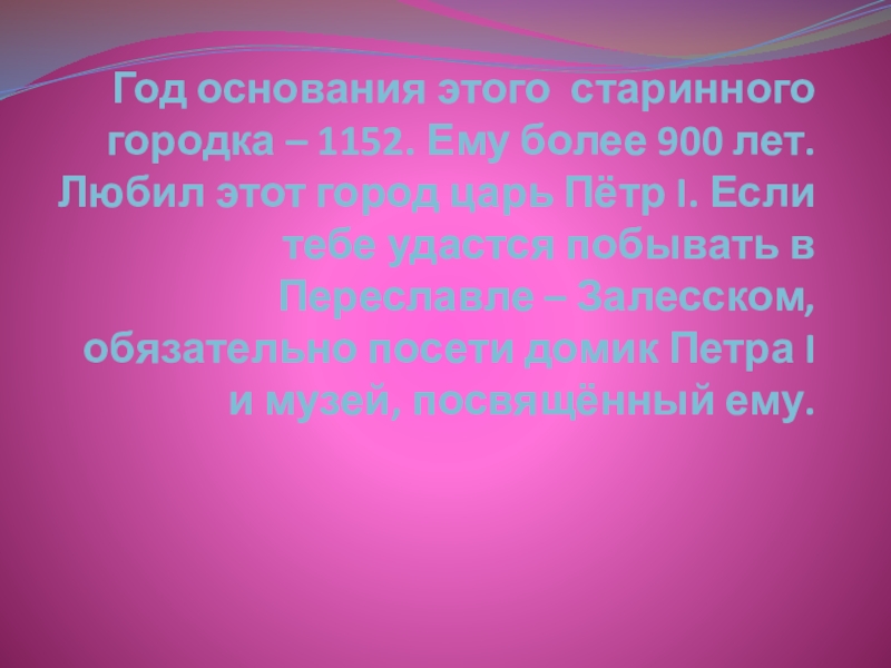 Любил этот город царь Пётр I. Если тебе удастся побывать в Переславле – Залесском, обязательно посети домик Петра I и музей, посвящённый ему.