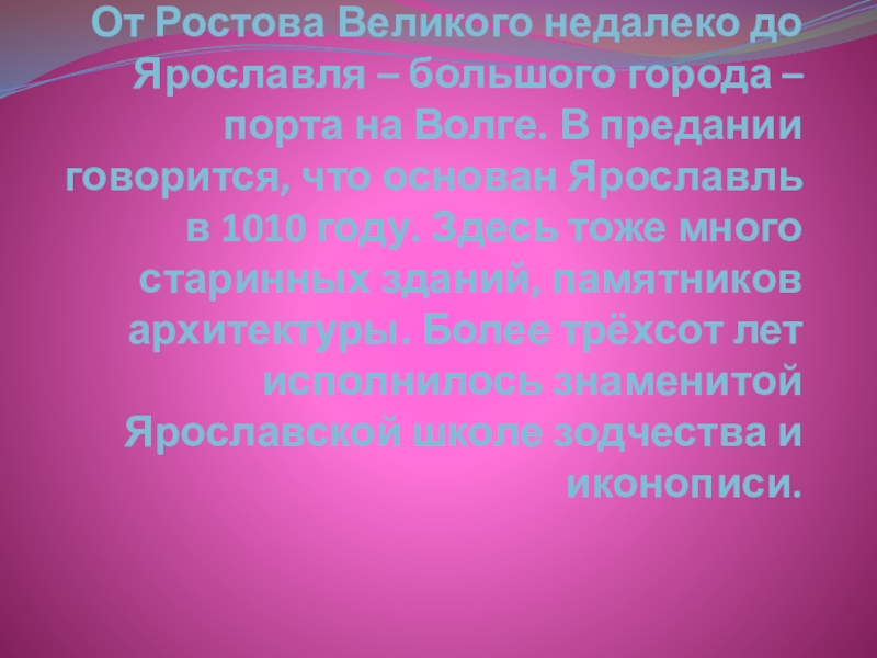 на Волге. В предании говорится, что основан Ярославль в 1010 году. Здесь тоже много старинных зданий, памятников архитектуры. Более трёхсот лет исполнилось знаменитой Ярославской школе зодчества и иконописи.