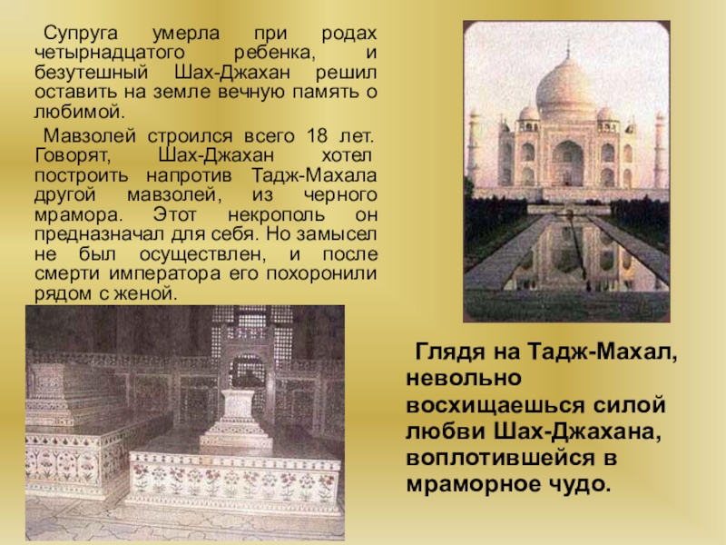 Глядя на Тадж-Махал, невольно восхищаешься силой любви Шах-Джахана, воплотившейся в мраморное чудо.