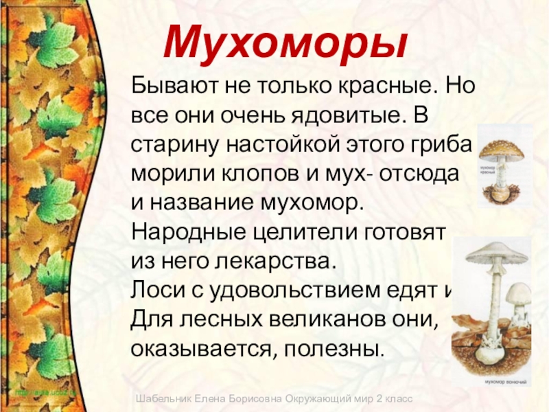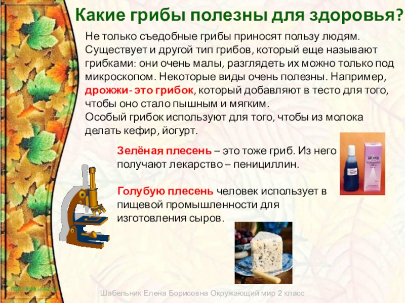 Не только съедобные грибы приносят пользу людям. Существует и другой тип грибов, который еще называют грибками: они очень малы, разглядеть их можно только под микроскопом. Некоторые виды очень полезны. Например, дрожжи- это грибок, который добавляют в тесто для того, чтобы оно стало пышным и мягким.