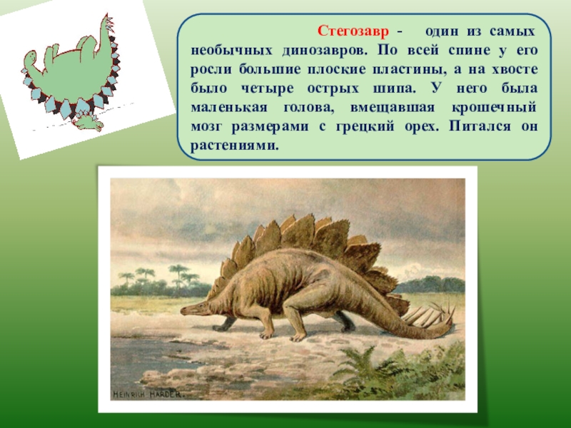 один из самых необычных динозавров. По всей спине у его росли большие плоские пластины, а на хвосте было четыре острых шипа. У него была маленькая голова, вмещавшая крошечный мозг размерами с грецкий орех. Питался он растениями.