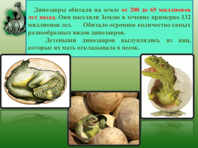 Детеныши динозавров вылуплялись из яиц, которые их мать откладывала в песок.