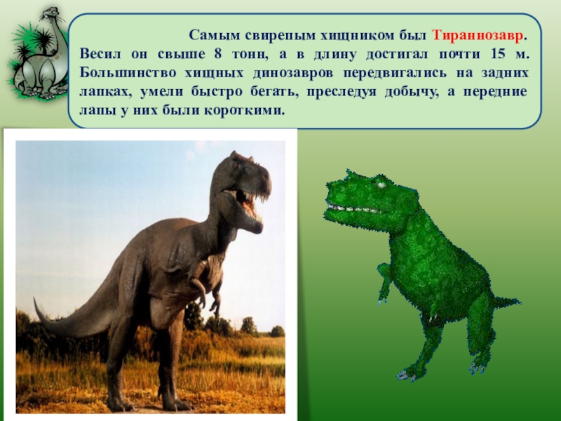 Весил он свыше 8 тонн, а в длину достигал почти 15 м. Большинство хищных динозавров передвигались на задних лапках, умели быстро бегать, преследуя добычу, а передние лапы у них были короткими.
