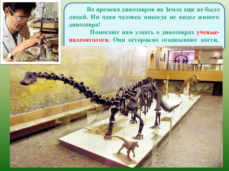 Помогают нам узнать о динозаврах ученые-палеонтологи. Они осторожно откапывают кости, соединяют их.