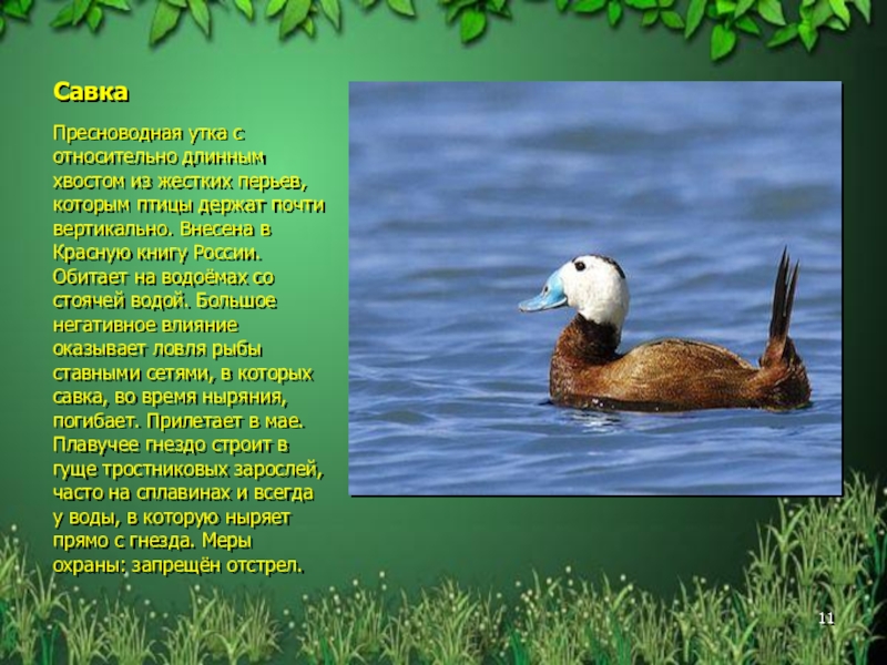 держат почти вертикально. Внесена в Красную книгу России. Обитает на водоёмах со стоячей водой. Большое негативное влияние оказывает ловля рыбы ставными сетями, в которых савка, во время ныряния, погибает. Прилетает в мае. Плавучее гнездо строит в гуще тростниковых зарослей, часто на сплавинах и всегда у воды, в которую ныряет прямо с гнезда. Меры охраны: запрещён отстрел.