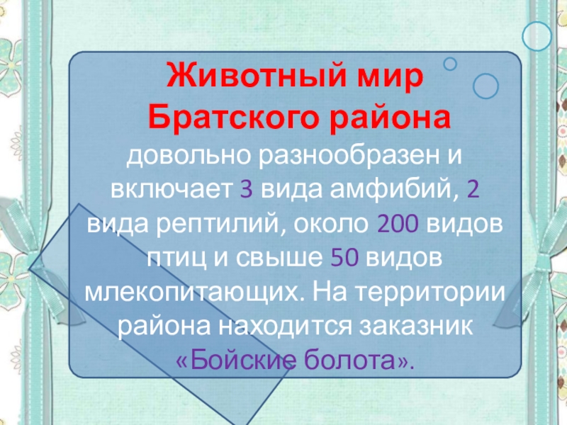 2 вида рептилий, около 200 видов птиц и свыше 50 видов млекопитающих. На территории района находится заказник «Бойские болота».