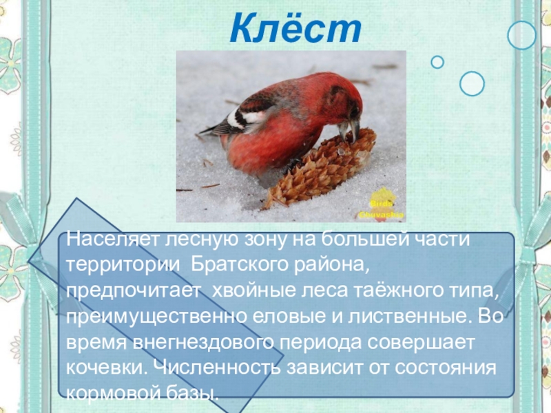 района, предпочитает хвойные леса таёжного типа, преимущественно еловые и лиственные. Во время внегнездового периода совершает кочевки. Численность зависит от состояния кормовой базы.