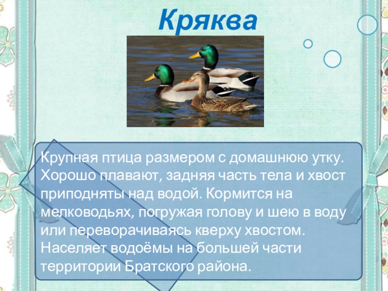 задняя часть тела и хвост приподняты над водой. Кормится на мелководьях, погружая голову и шею в воду или переворачиваясь кверху хвостом. Населяет водоёмы на большей части территории Братского района.