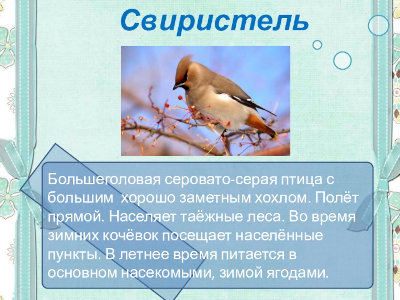 Полёт прямой. Населяет таёжные леса. Во время зимних кочёвок посещает населённые пункты. В летнее время питается в основном насекомыми, зимой ягодами.