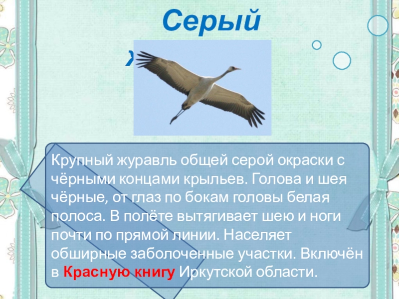 концами крыльев. Голова и шея чёрные, от глаз по бокам головы белая полоса. В полёте вытягивает шею и ноги почти по прямой линии. Населяет обширные заболоченные участки. Включён в Красную книгу Иркутской области.