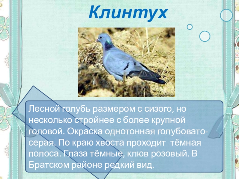 с более крупной головой. Окраска однотонная голубовато-серая. По краю хвоста проходит тёмная полоса. Глаза тёмные, клюв розовый. В Братском районе редкий вид.
