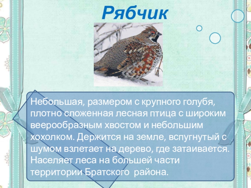 птица с широким веерообразным хвостом и небольшим хохолком. Держится на земле, вспугнутый с шумом взлетает на дерево, где затаивается. Населяет леса на большей части территории Братского района.
