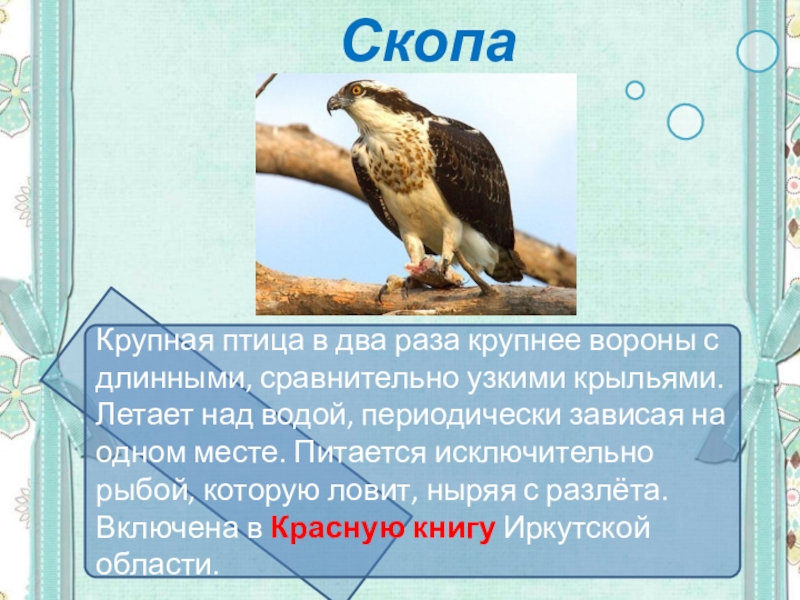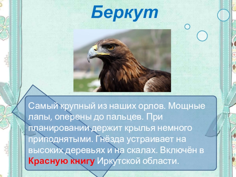 до пальцев. При планировании держит крылья немного приподнятыми. Гнёзда устраивает на высоких деревьях и на скалах. Включён в Красную книгу Иркутской области.