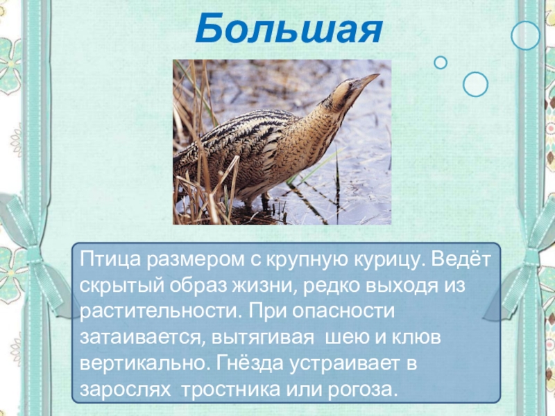 образ жизни, редко выходя из растительности. При опасности затаивается, вытягивая шею и клюв вертикально. Гнёзда устраивает в зарослях тростника или рогоза.