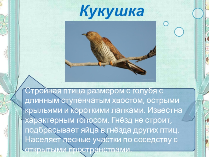 хвостом, острыми крыльями и короткими лапками. Известна характерным голосом. Гнёзд не строит, подбрасывает яйца в гнёзда других птиц. Населяет лесные участки по соседству с открытыми пространствами.