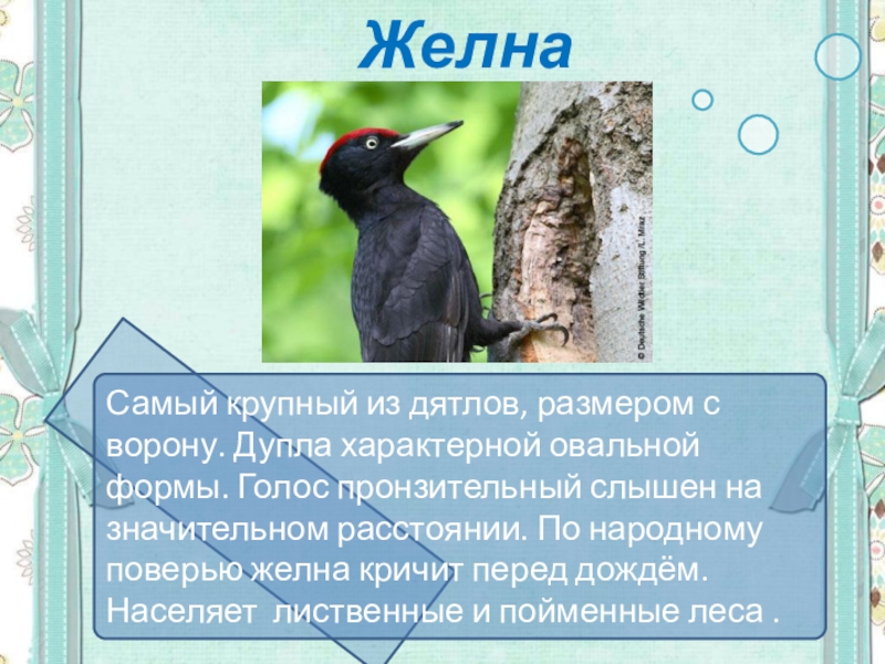 характерной овальной формы. Голос пронзительный слышен на значительном расстоянии. По народному поверью желна кричит перед дождём. Населяет лиственные и пойменные леса .