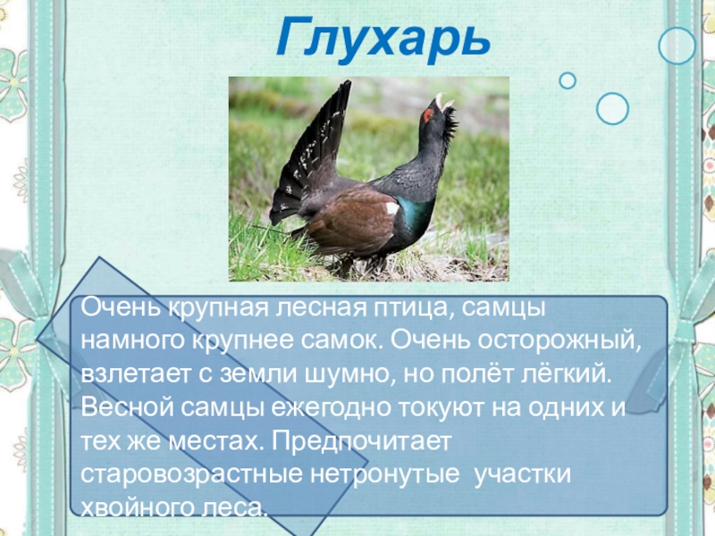 Размером с домашнюю курицу. Полёт шумный прямолинейный. Весной самцы