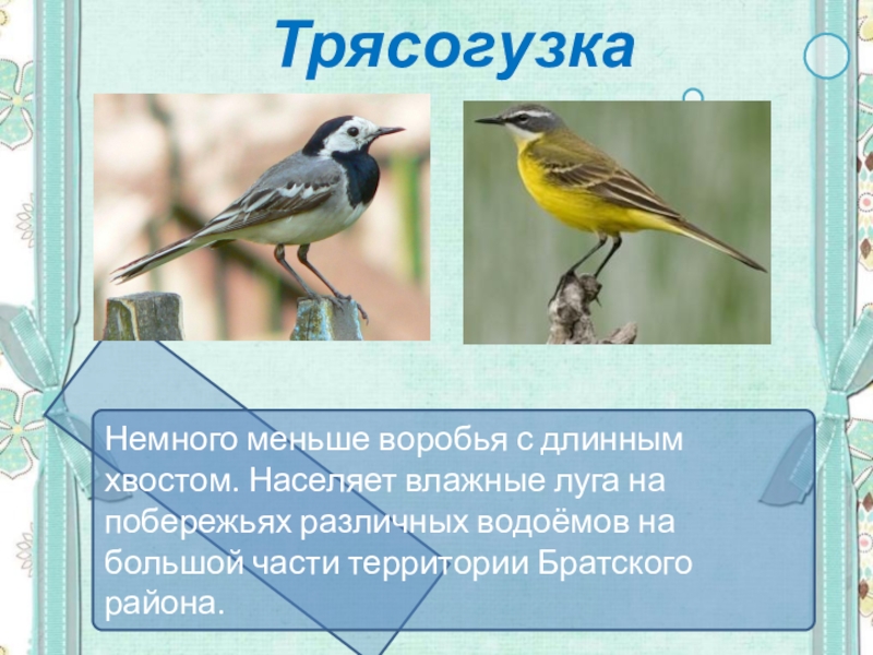 Немного меньше воробья с длинным хвостом. Населяет влажные луга