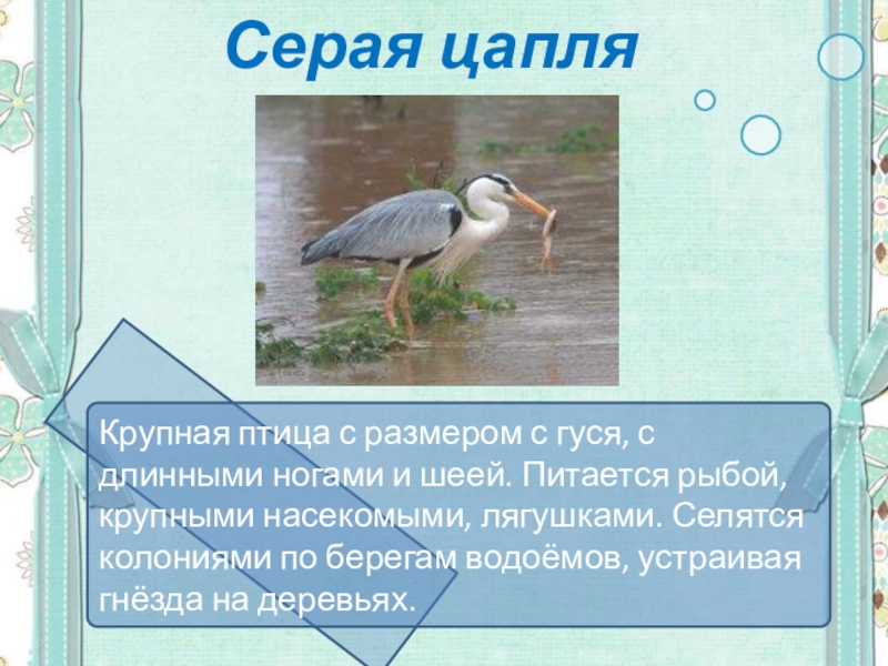 шеей. Питается рыбой, крупными насекомыми, лягушками. Селятся колониями по берегам водоёмов, устраивая гнёзда на деревьях.