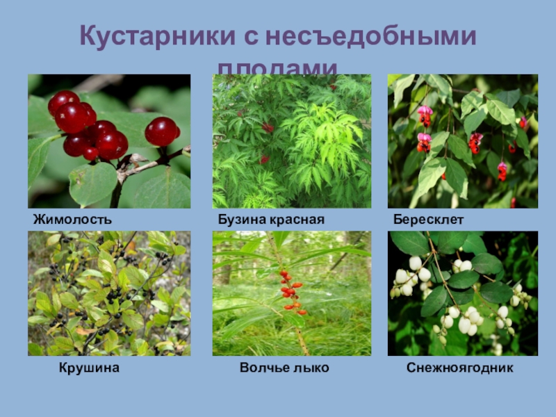 Кустарники с несъедобными плодамиЖимолость краснаяБузина красная Бересклет Крушина Волчье лыкоСнежноягодник
