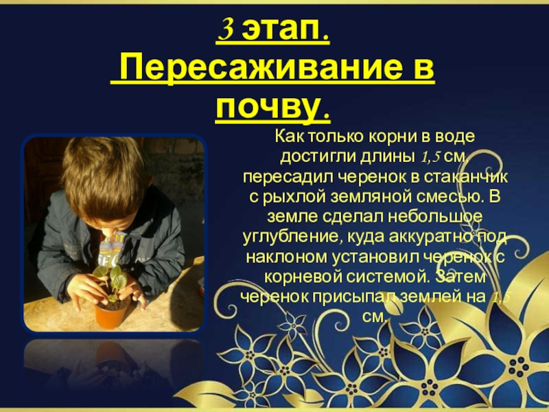 длины 1,5 см, пересадил черенок в стаканчик с рыхлой земляной смесью. В земле сделал небольшое углубление, куда аккуратно под наклоном установил черенок с корневой системой. Затем черенок присыпал землей на 1,5 см.