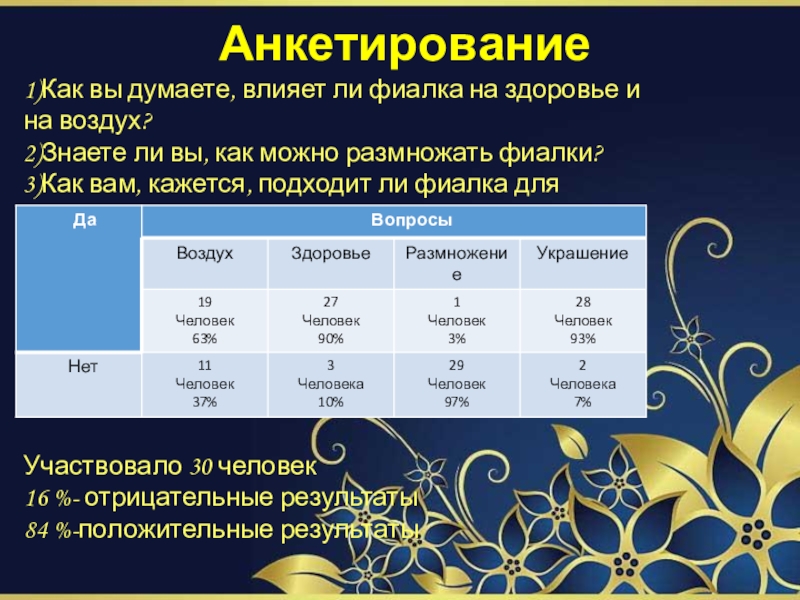 1)Как вы думаете, влияет ли фиалка на здоровье и на воздух?