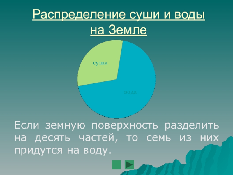 Распределение суши и воды  на Земле сушаводаЕсли земную поверхность разделить на десять частей, то семь из