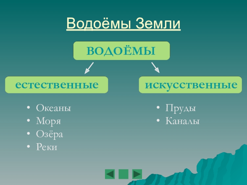 Водоёмы ЗемлиВОДОЁМЫестественные Океаны Моря Озёра Реки Пруды Каналы