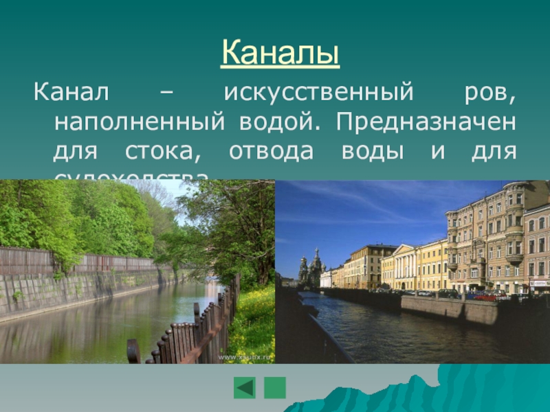 КаналыКанал – искусственный ров, наполненный водой. Предназначен для стока, отвода воды и для судоходства.