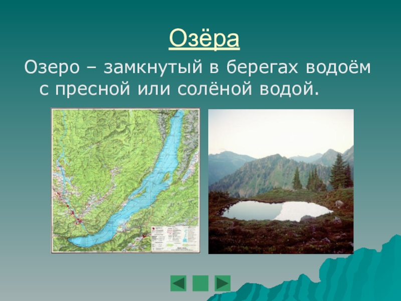 ОзёраОзеро – замкнутый в берегах водоём с пресной или солёной водой.
