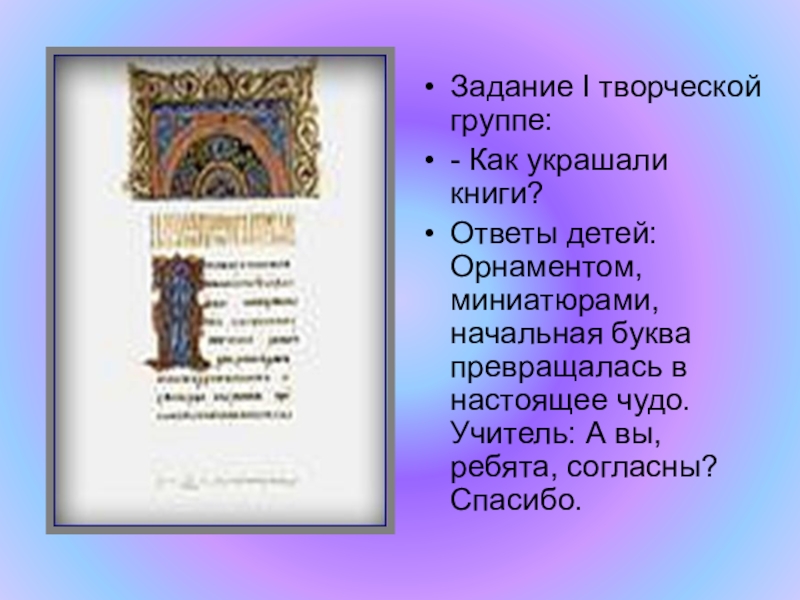 Ответы детей: Орнаментом, миниатюрами, начальная