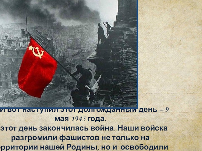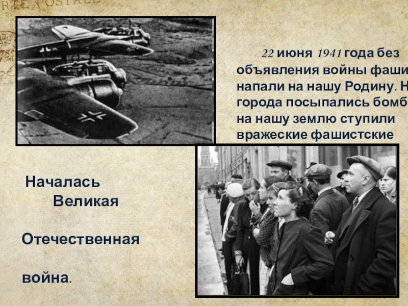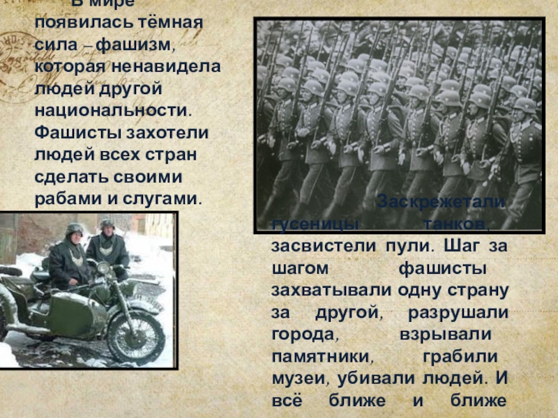 Заскрежетали гусеницы танков, засвистели пули. Шаг за шагом фашисты захватывали одну страну за другой, разрушали города, взрывали памятники, грабили музеи, убивали людей. И всё ближе и ближе подходили к границе нашей Родины.