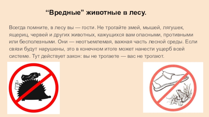 Всегда помните, в лесу вы — гости. Не трогайте змей, мышей, лягушек, ящериц, червей и других животных, кажущихся вам опасными, противными или бесполезными. Они — неотъемлемая, важная часть лесной среды. Если связи будут нарушены, это в конечном итоге может нанести ущерб всей системе. Тут действует закон: вы не трогаете — вас не трогают.