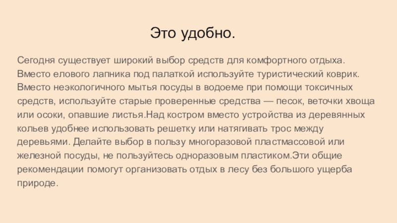 Сегодня существует широкий выбор средств для комфортного отдыха. Вместо елового лапника под палаткой используйте туристический коврик.Вместо неэкологичного мытья посуды в водоеме при помощи токсичных средств, используйте старые проверенные средства — песок, веточки хвоща или осоки, опавшие листья.Над костром вместо устройства из деревянных кольев удобнее использовать решетку или натягивать трос между деревьями. Делайте выбор в пользу многоразовой пластмассовой или железной посуды, не пользуйтесь одноразовым пластиком.Эти общие рекомендации помогут организовать отдых в лесу без большого ущерба природе.
