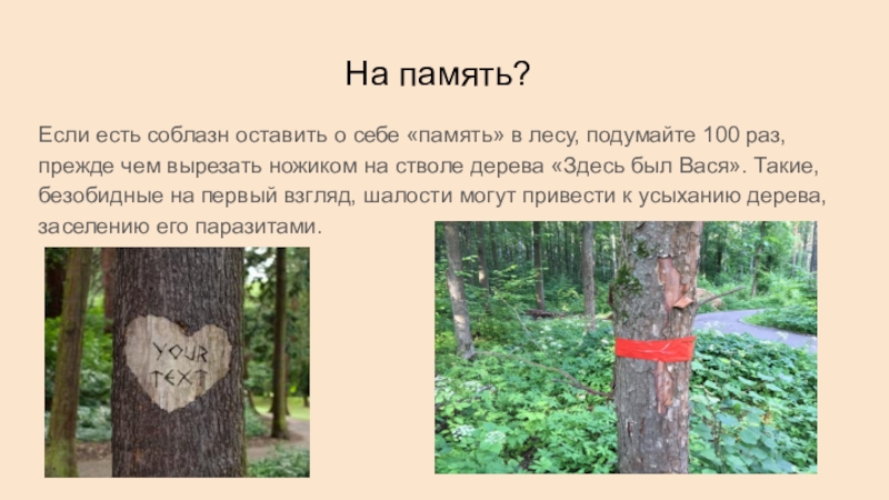 Если есть соблазн оставить о себе «память» в лесу, подумайте 100 раз, прежде чем вырезать ножиком на стволе дерева «Здесь был Вася». Такие, безобидные на первый взгляд, шалости могут привести к усыханию дерева, заселению его паразитами.