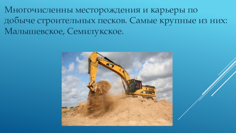 Слайд 9Многочисленны месторождения и карьеры по добыче строительных песков. Самые крупные из