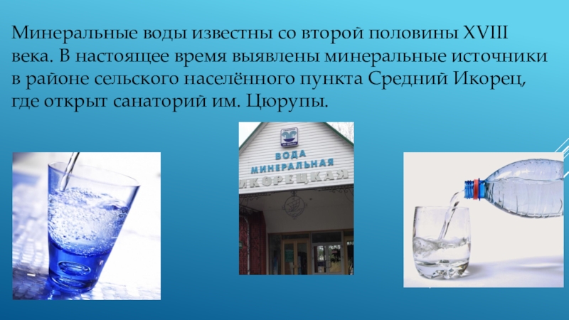 Слайд 15Минеральные воды известны со второй половины XVIII века. В настоящее время