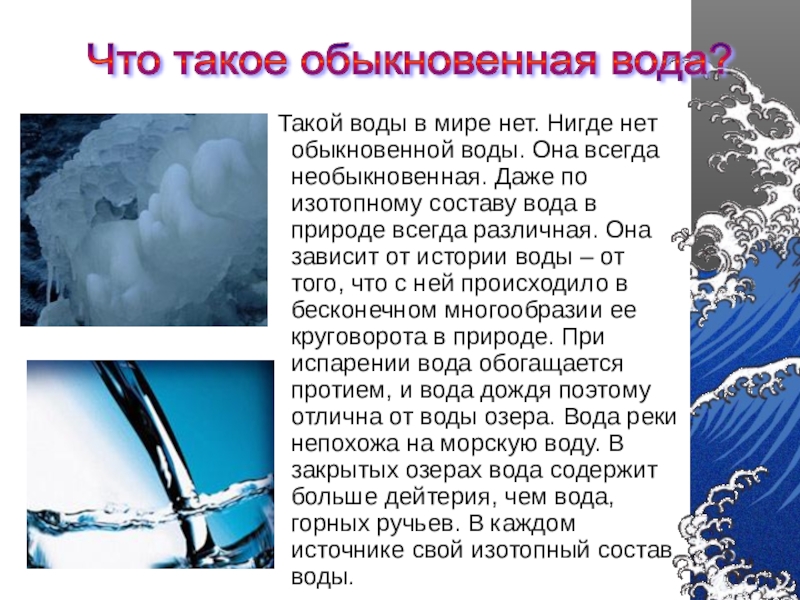 Слайд 3 Такой воды в мире нет. Нигде нет обыкновенной воды.
