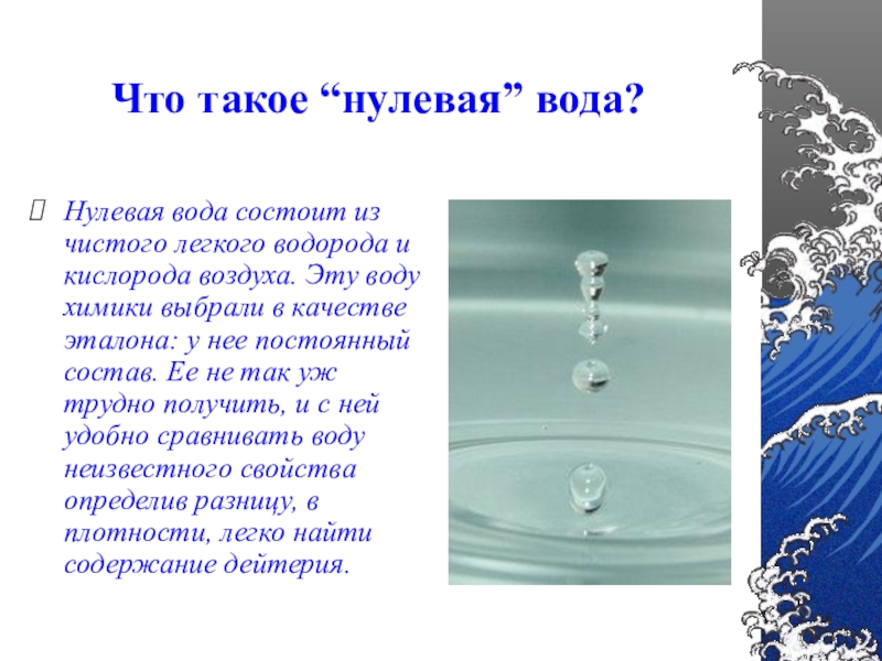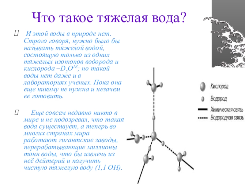 школьники –H2O. Но такой воды в природе нет. Такую воду с огромным трудом приготовили ученые. Она им понадобилась для точного измерения свойств воды, и в первую очередь для измерения ее плотности. Пока такая вода существует только в нескольких крупнейших лабораториях мира, где изучают свойства различных изотопных соединений.