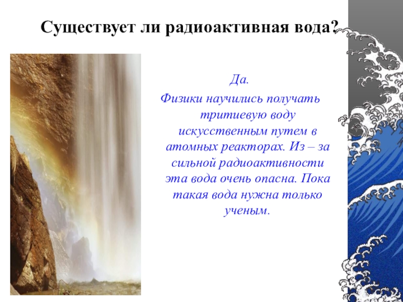 в атомных реакторах. Из – за сильной радиоактивности эта вода очень опасна. Пока такая вода нужна только ученым.