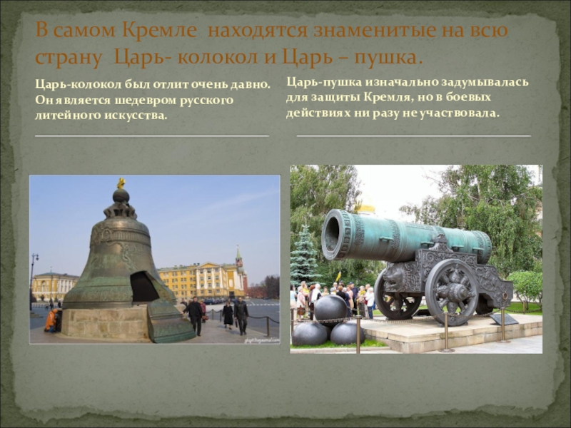 Царь-пушка изначально задумывалась для защиты Кремля, но в боевых действиях ни разу не участвовала.