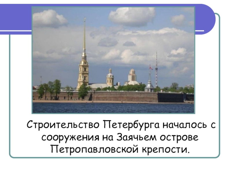Слайд 10 Строительство Петербурга началось с сооружения на Заячьем острове Петропавловской крепости.