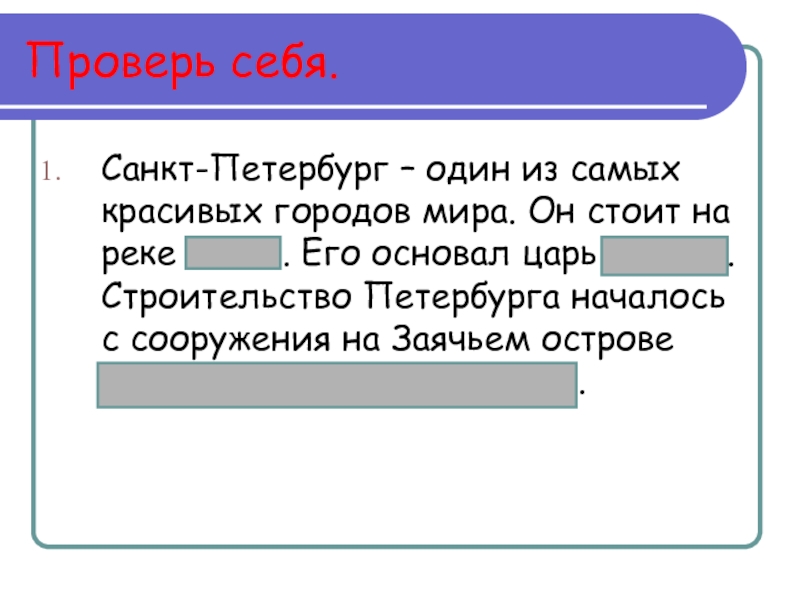 Проверь себя.Санкт-Петербург – один из самых красивых городов мира. Он стоит на реке Неве . Его основал