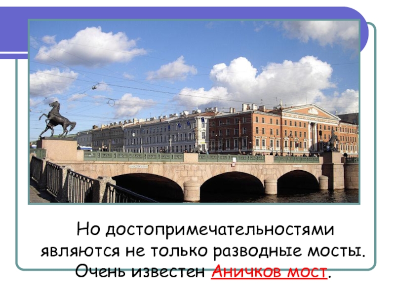 Слайд 22 Но достопримечательностями являются не только разводные мосты. Очень известен Аничков мост.