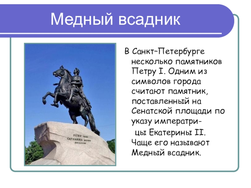 Медный всадник  В Санкт–Петербурге несколько памятников Петру I. Одним из символов города считают памятник, поставленный на