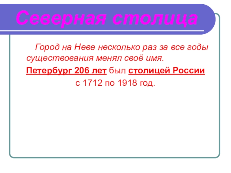 Северная столица    Город на Неве несколько раз за все годы существования менял своё имя.Петербург