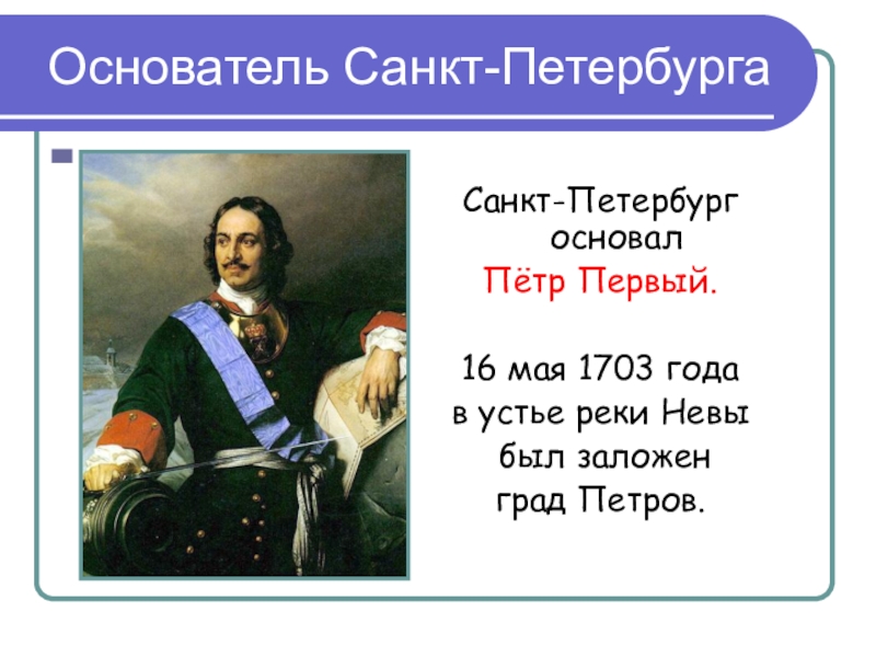Основатель Санкт-ПетербургаСанкт-Петербург основал Пётр Первый. 16 мая 1703 года в устье реки Невы был заложен град